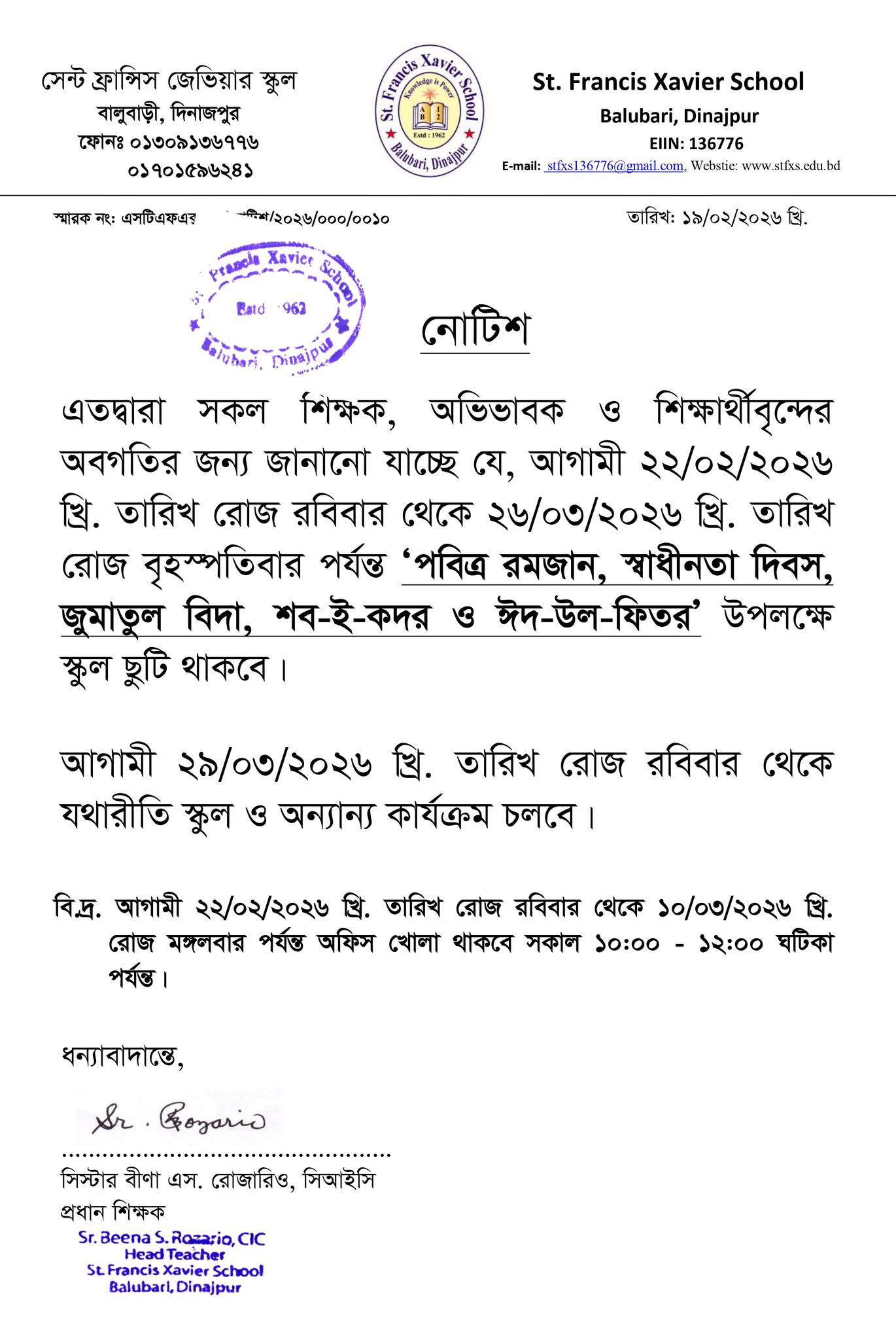 পবিত্র রমজান,ঈদ-উল-ফিতর, স্বাধীনতা দিবস উপলক্ষে ছুটির নোটিশ